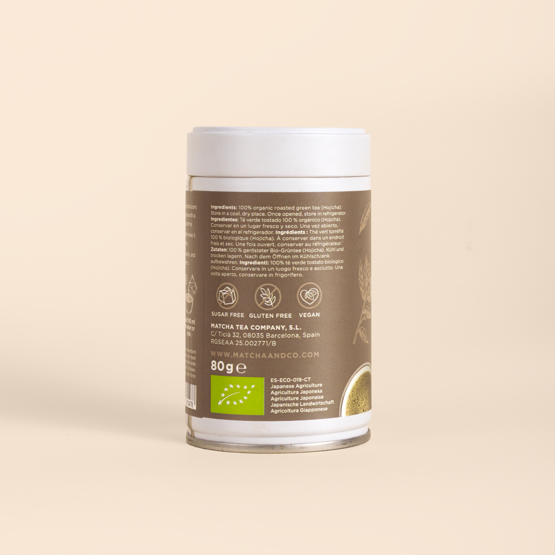 Pó de chá Hojicha orgânico cultivado no Japão. Elaborado a partir de folhas de chá verde tostadas, com baixo teor de cafeína e ligeiro sabor a fumado. Ideal para desfrutar em qualquer momento do dia.