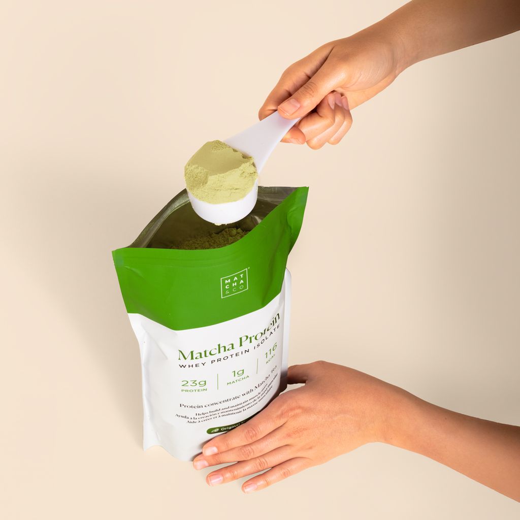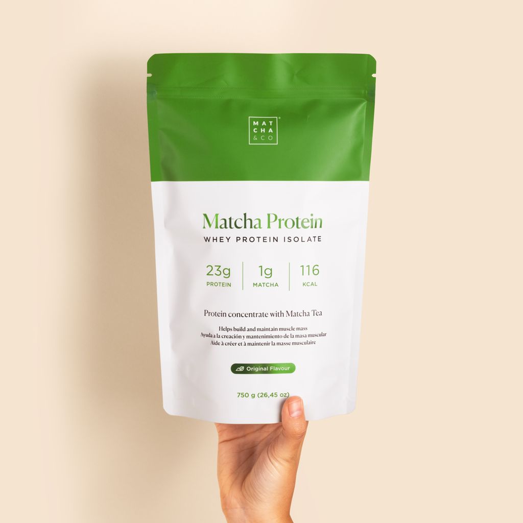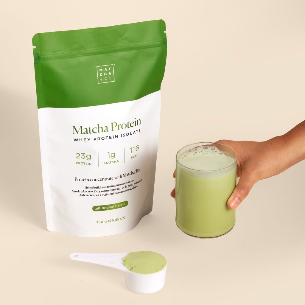 Matcha Proteína contém 750 gramas, o que equivale a 25 doses de 30 gramas.