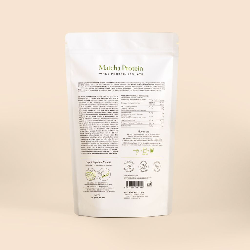 Matcha Proteína (Sabor original): proteína de soro concentrada (leite), proteína isolada de soro (leite), chá matcha, lecitina de girassol, aroma natural. Matcha Proteína (Sabor chocolate): proteína de soro concentrada (leite), proteína isolada de soro (leite), chá matcha, cacau em pó desengordurado, pó de infusão de fruta do monge, aroma a cacau, lecitina de girassol. Matcha Proteína (Sabor baunilha): proteína de soro concentrada (leite), proteína isolada de soro (leite), chá matcha, aroma de baunilha, lecitina de girassol, aroma natural.